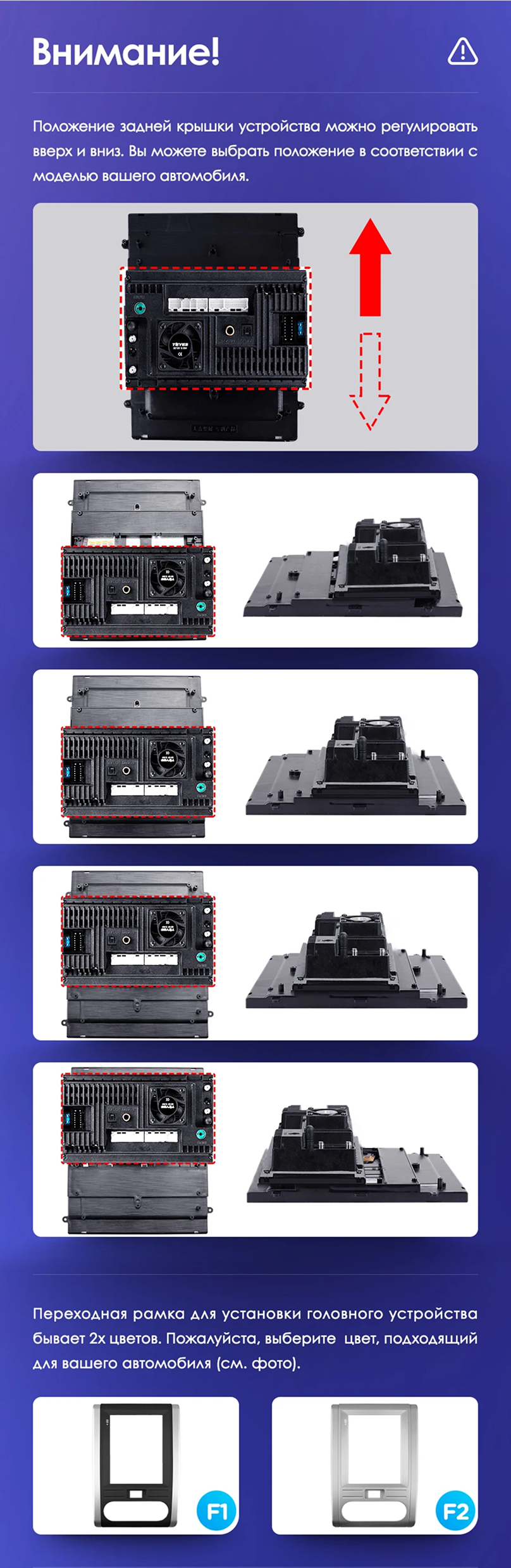 Вертикальная установка магнитолы закрывается специальной рамкой под определённый автомобиль. Утончённый, лаконичный дизайн Teyes TPRO 2 подойдёт под любую премиальную обшивку салона. Большой выбор цветовых решений интерфейса позволяет создавать индивидуальное оформление, чтобы мерцания и анимации на мониторе не отвлекали от езды. Teyes TPRO 2 - это симбиоз передовых технологий, созданный для вашего комфорта и безопасности.
