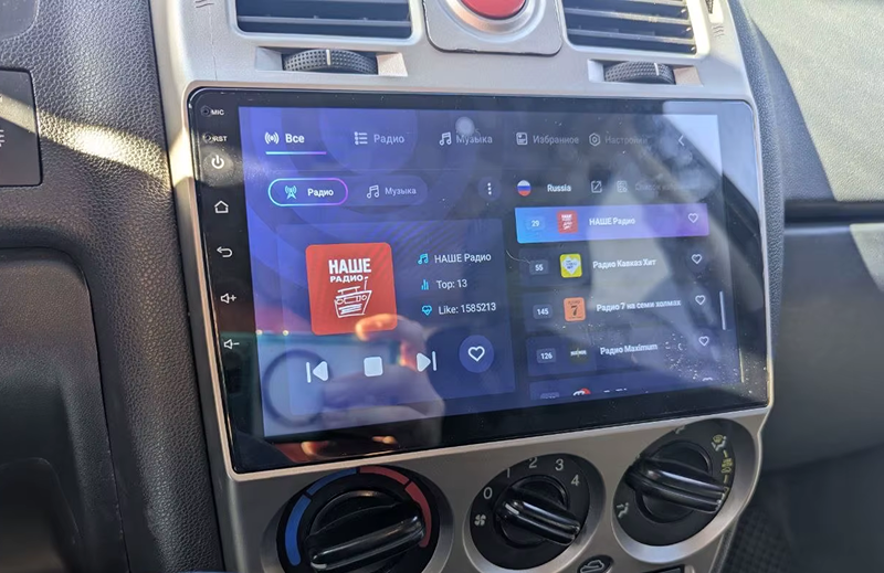 Защитное стекло 2,5D имеет слегка скругленные грани. Эта особенность делает его практически незаметным в районе краев экрана магнитолы, где он ограничен рамками корпуса.
