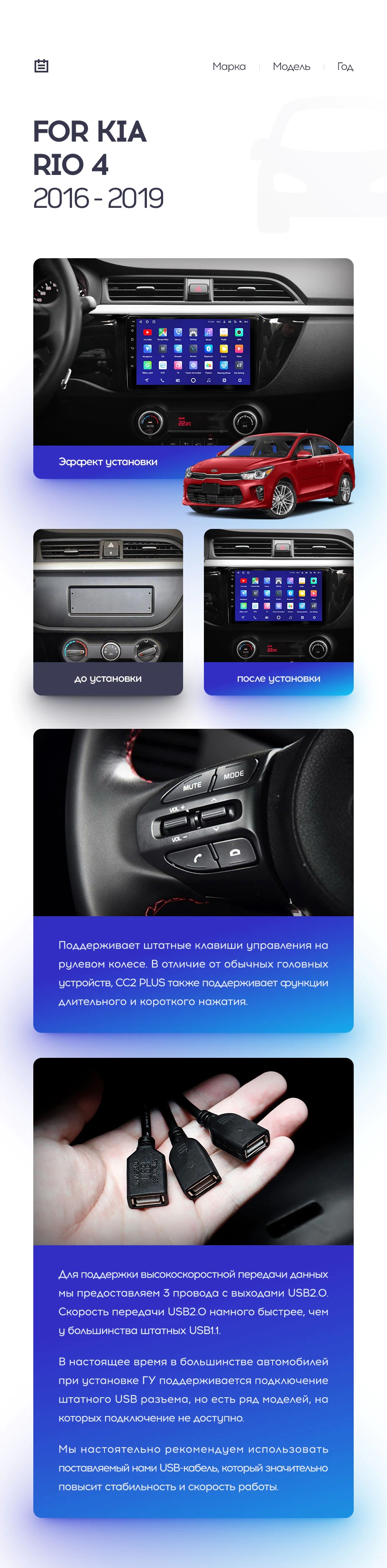 Полный комплект установки магнитолы Teyes с рамкой и проводкой можно выбрать в каталоге штатных магнитол Kia RIO 4 (2016-2019).