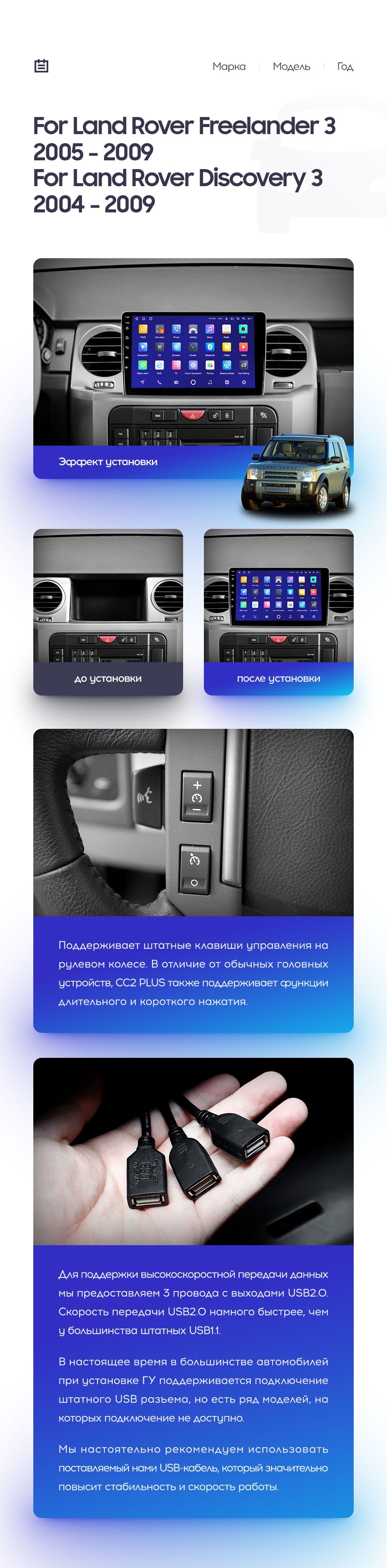 Полный комплект установки магнитолы Teyes с рамкой и проводкой можно выбрать в каталоге штатных магнитол Land Rover Discovery 3 (2004-2009).