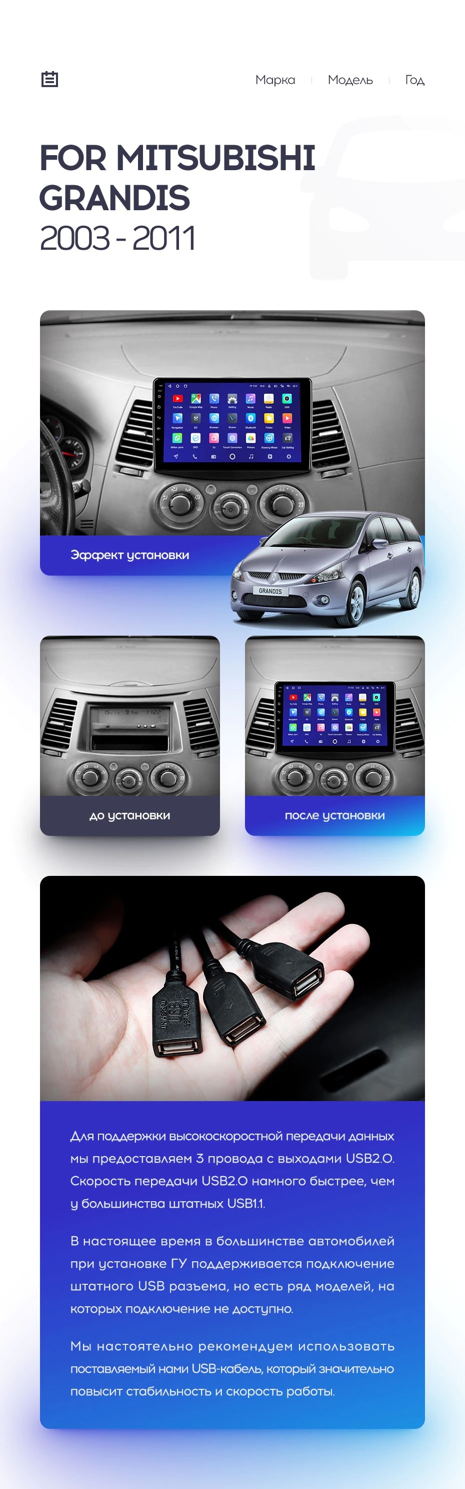 Полный комплект установки магнитолы Teyes с рамкой и проводкой можно выбрать в каталоге штатных магнитол Mitsubishi Grandis 1 (2003-2010).