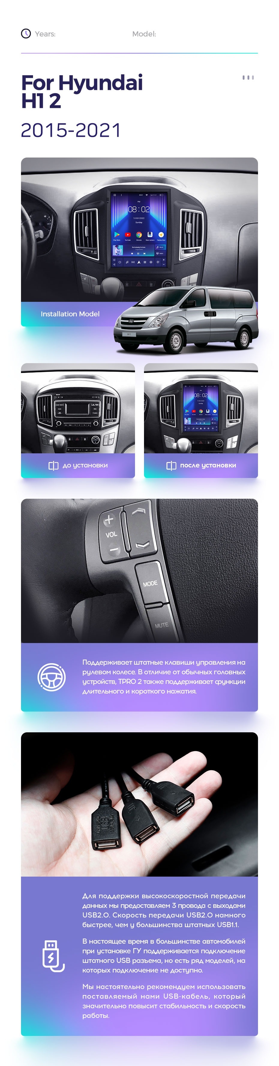 Полный комплект установки магнитолы Teyes с рамкой и проводкой можно выбрать в каталоге штатных магнитол Hyundai H1 TQ (2015-2021).